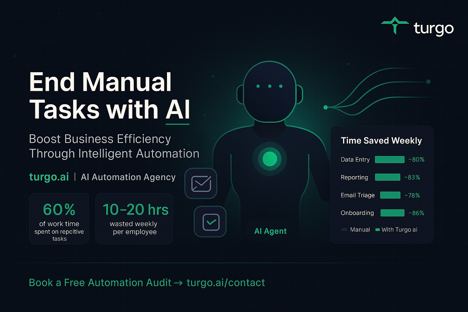 Ending manual tasks transforms businesses by reclaiming time for strategy and growth. Turgo.ai delivers done-for-you AI agents and workflows that run autonomously, with full management to ensure lasting results. Ready to eliminate repetitive work? Book a free automation audit at https://turgo.ai/contact.
